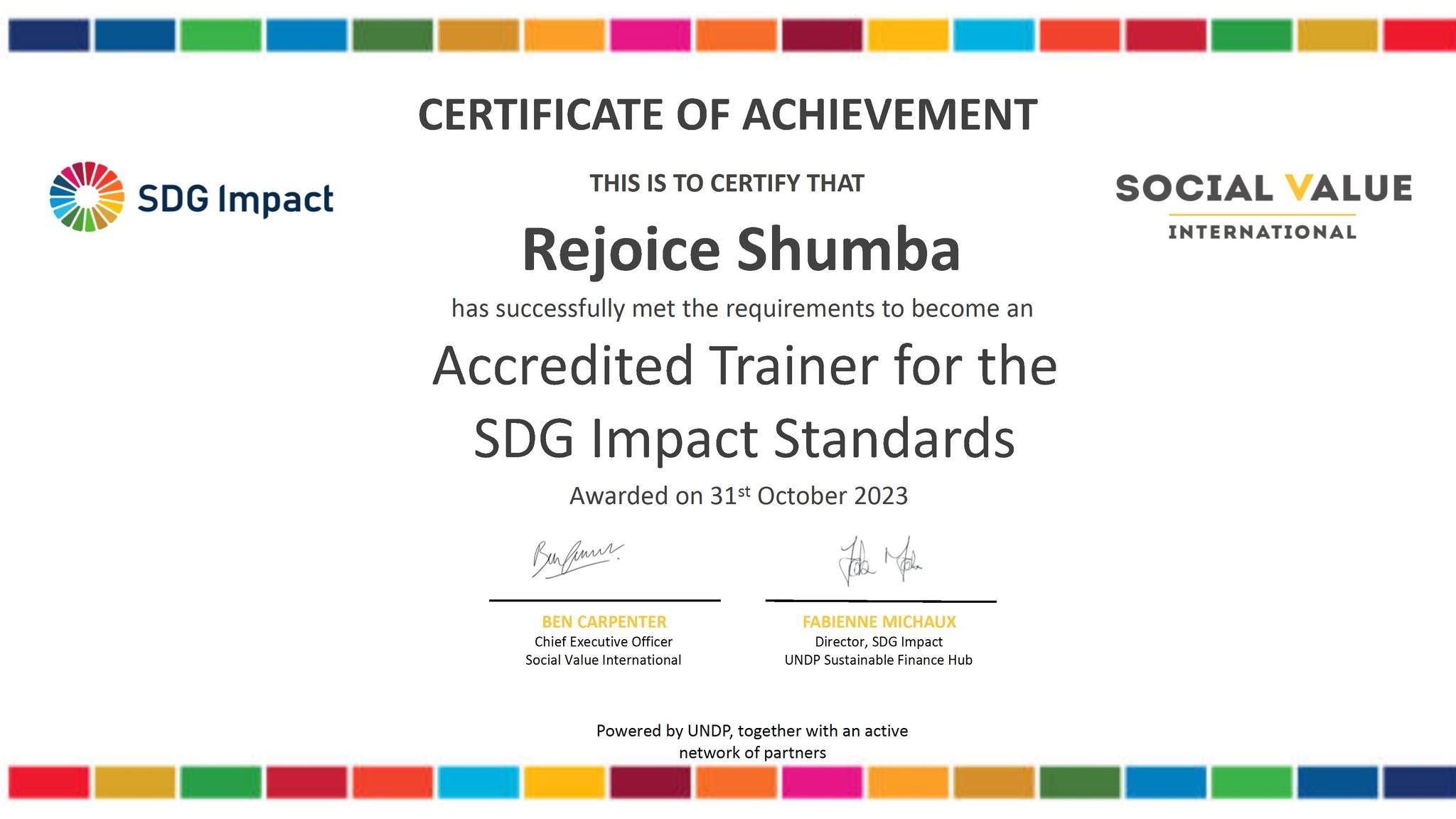 Our visionary leader, Dr Rejoice Shumba, has achieved accreditation as a United Nations Sustainable Development Goals (SDGs) Trainer for Impact Standards. Dr Shumba’s role as an SDG trainer directly contributes to advancing the global agenda for sustainable development, tackling critical issues such as poverty, inequality, and climate action on a broader scale. With her expertise, she is able to make an even greater impact by educating and inspiring others to adopt sustainable practices, creating a ripple effect across all Siyakholwa Consulting’s projects and programmes.
